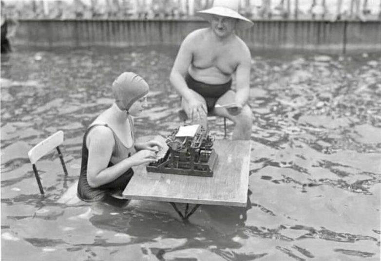 Бизнесмен и секретарша работают в бассейне во время сильной жары в Берлине, Германия, 1926 год