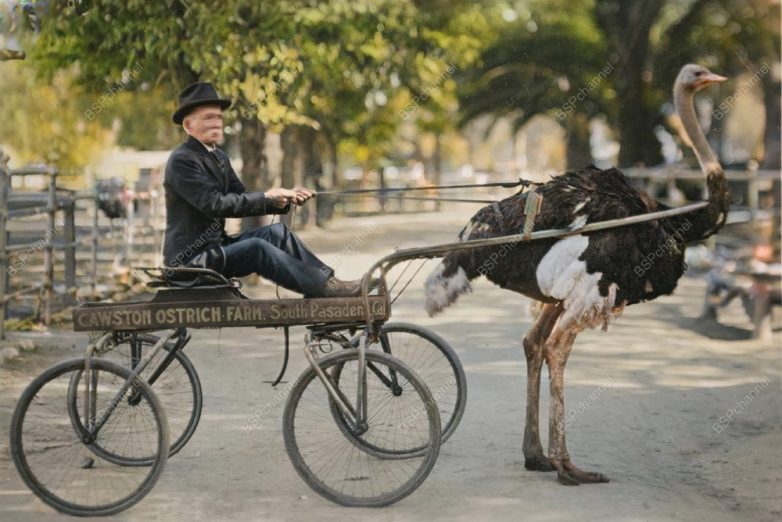 Страус тянет повозку на страусиной ферме Коустон в Южной Пасадене, Калифорния, около 1915 года.