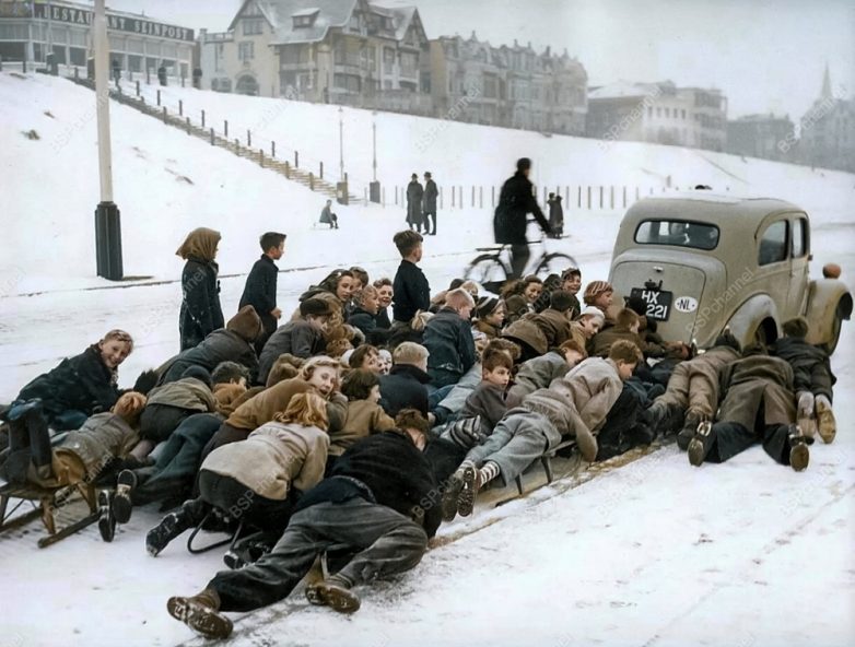 Автомобиль катает детей на санях на заснеженной дороге в Схевенингене, Нидерланды. 1940-е.