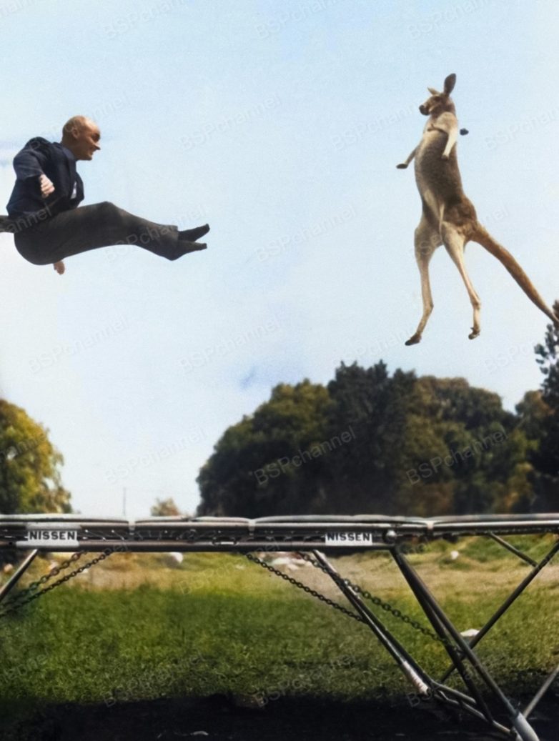 Первый в мире современный батут появился в 1936 году благодаря усилиям Джорджа Ниссена, чемпиона по прыжкам в воду и акробатике. Сконструировав прототип в собственном гараже, он соединил отрезок брезента с металлическим каркасом на эластичных жгутах. Хотя изначально устройство задумывалось для тренировок акробатов, очень скоро оно обрело огромную популярность далеко за пределами спортивных залов. Джордж Ниссен придумал оригинальный способ рекламы: он взял в аренду кенгуру Викторию и устроил с ней показательные прыжки на батуте в Центральном парке. Неделю изобретатель буквально «ставил» ей прыжок, поддерживая за лапы, чтобы она пружинила в одном ритме с ним. Результатом этих тренировок стала эта фотография.