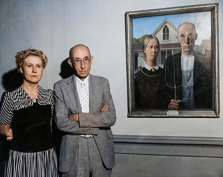 Герои картины «Американская готика» художника Гранта Вуда. Художнику позировали его дантист и его сестра Нэн, 1930 год.