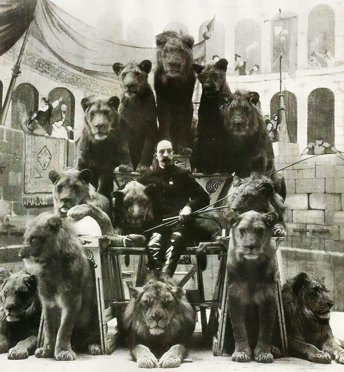 На этой фотографии известный артист цирка и укротитель животных Джек Бонавита позирует с 13 львами в рамках своего номера “Кресло”. Позже он начал работать с белыми медведями, и это решение стало для него роковым.