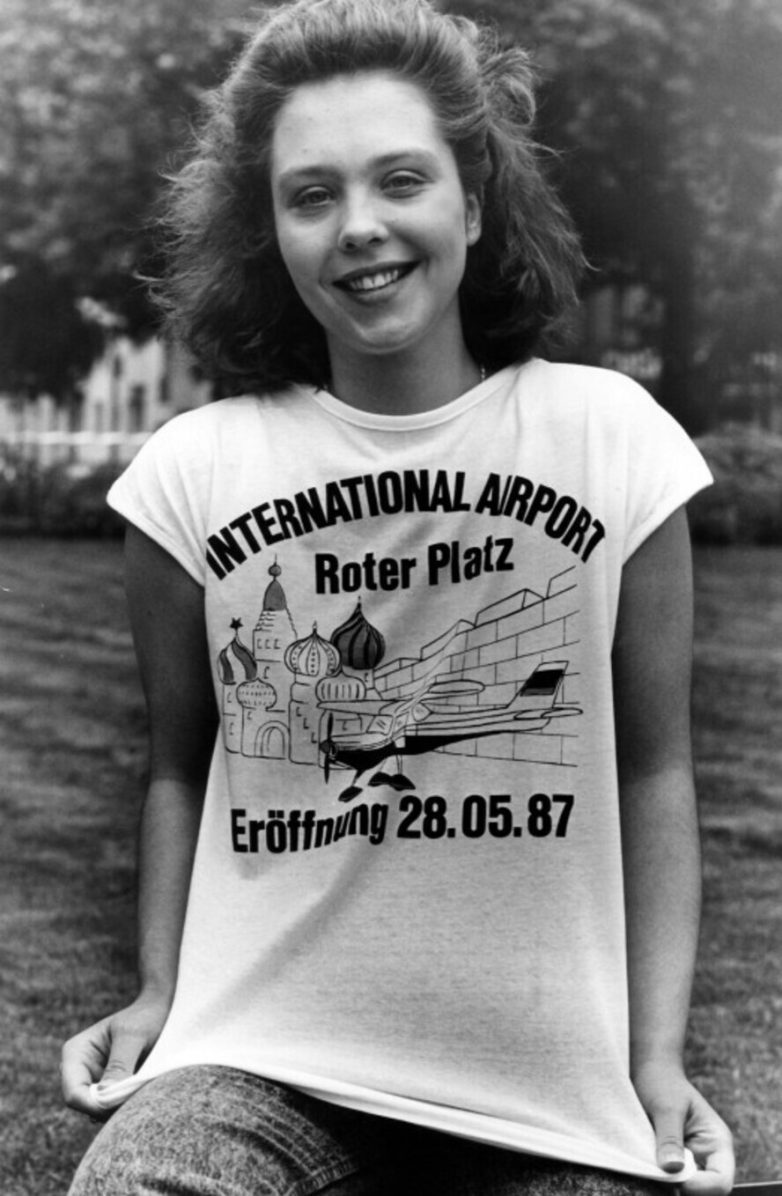 Поклонница Матиуса Руста в футболке с принтом „Международный аэропорт Красная площадь“, 1987 год, ФРГ
