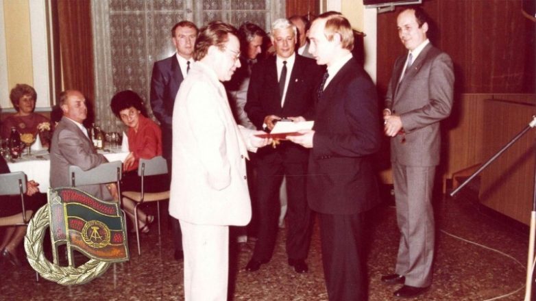 Награждение офицера отдела КГБ Владимира Путина золотым значком дружбы между Германией и Советским Союзом. Дрезден, ГДР, 21 ноября 1987 года.