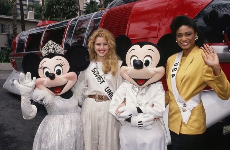 Мисс СССР Ева Стальбовская и Мисс США Кэрол Гист позируют с Минни и Микки Маусом во время фотосессии в Диснейленде, 16 апреля 1990 г.