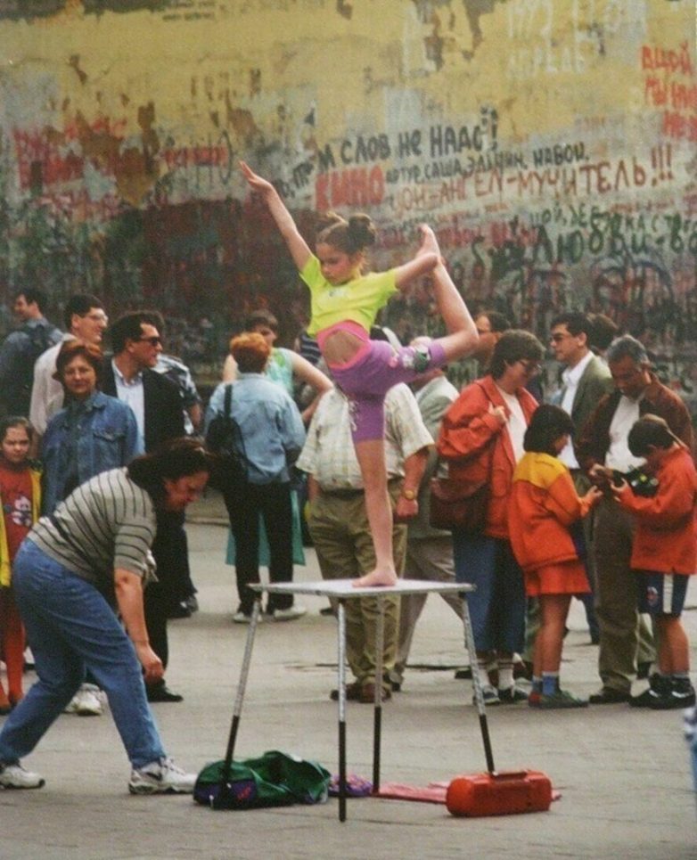 Девочка выполняет акробатические упражнения под музыку для заработка денег у стены Цоя в Москве
