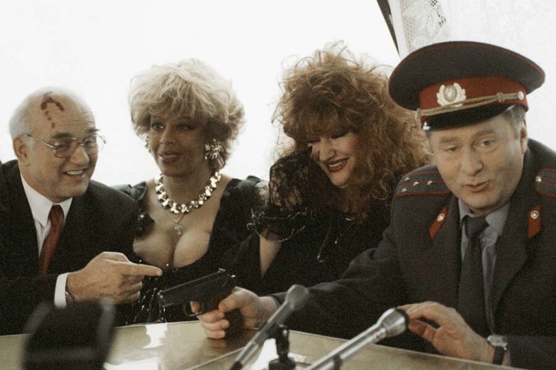 Владимир Жириновский и актёры-двойники известных личностей на съёмках фильма «Корабль двойников», 1996 год