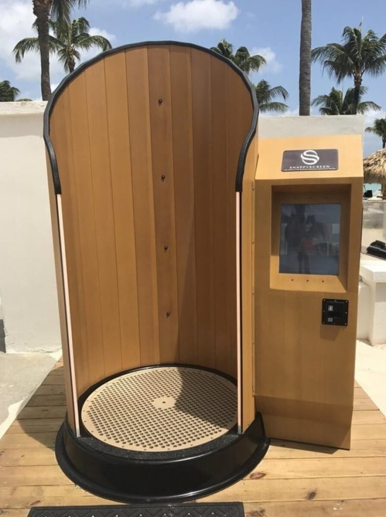 Здесь на пляже автоматически аппарат нанесет солнцезащитный крем – вращается вокруг человека. Аруба