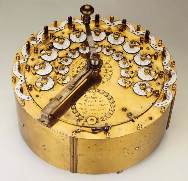 15. Счётная машина, созданная Филиппом Маттеусом Ганом. Это был первый калькулятор, способный складывать, вычитать, делить и умножать в одном устройстве, с разрядностью 11 разрядов. Германия, герцогство Вюртемберг, 1770–1774 гг.