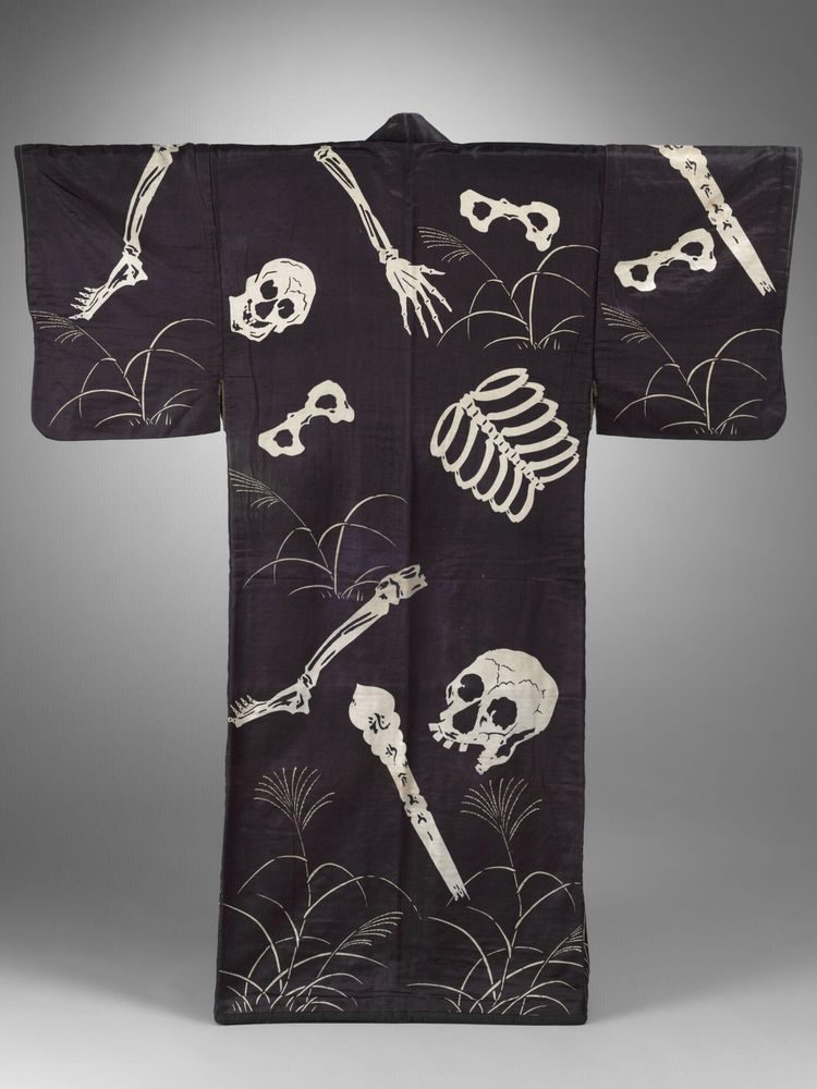 14. Кимоно, украшенное скелетами, из Японии, 1840–1860 гг. н. э., ныне хранится в Музее Виктории и Альберта в Лондоне