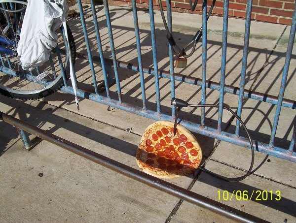 Автомобиль на эскалаторе? Хм. Пицца, пристёгнутая велозамком, как последний рубеж безопасности? Легко!