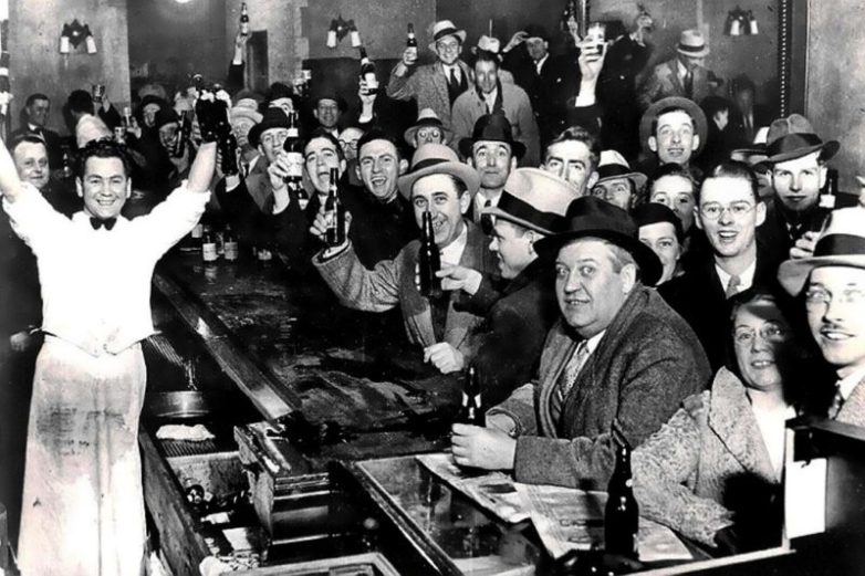 На фотографии отражены радость и свобода, когда люди поднимают бокалы за возвращение легального употребления алкоголя. Удивительно, но и сегодня в 10 штатах есть округа, где продажа спиртного по-прежнему запрещена.