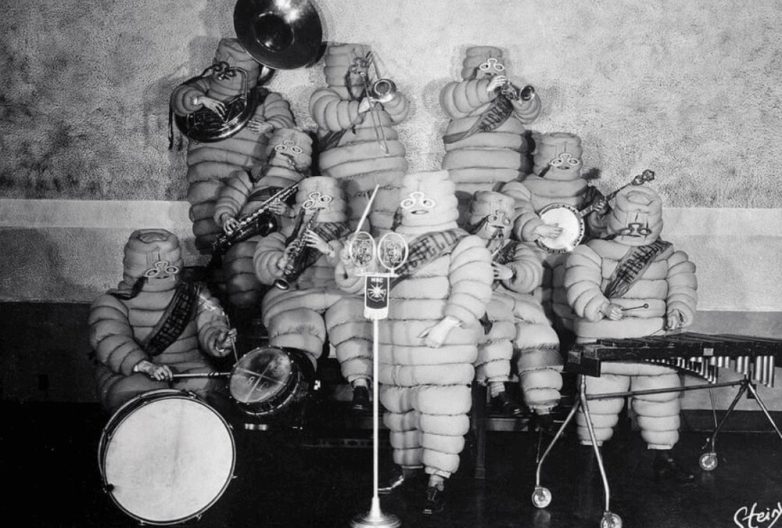 И снова маскоты «Мишлен», на этот раз даже группа. Выступление на открытии радиошоу «Час Мишлен», 1928-й