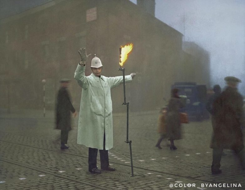 1935 год, Лондон: газовый факел помогает полицейскому регулировать движение в лондонском тумане