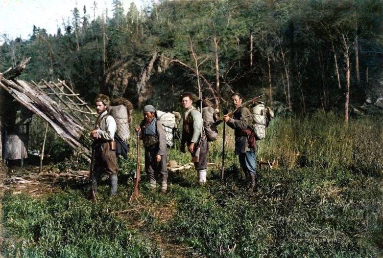 Владимир Арсеньев, Дерсу Узала, солдат Фокин и Чжан Бао (слева направо) в походе по бассейну реки Такема