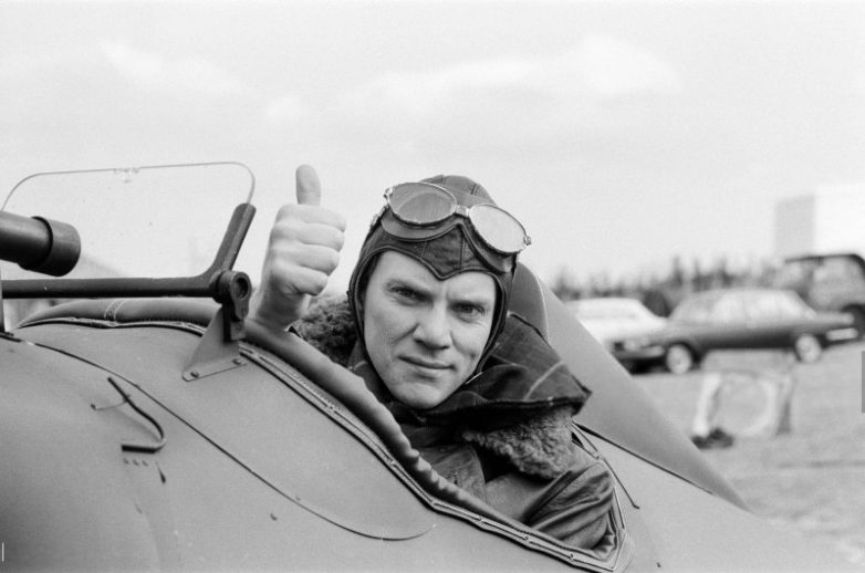 8 сентября 1975 года. Малкольм Макдауэлл на съёмках фильма «Асы в небе» (Aces High). Фото Freddie Reed.
