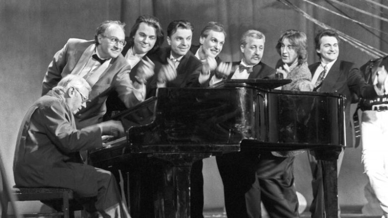 Юрий Саульский, Матвей Ганапольский, Константин Эрнст, Леонид Парфенов, Михаил Марфин, Леонид Якубович, Леонид Ярмольник и Дмитрий Дибров на встрече, посвященной тридцатилетию КВН.