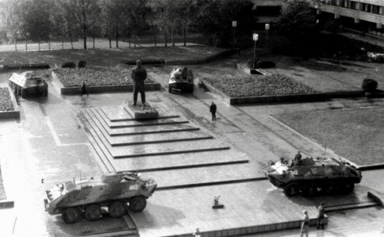 Памятник Ленину в Клайпеде, охраняют БТР советской армии, 1990 г.
