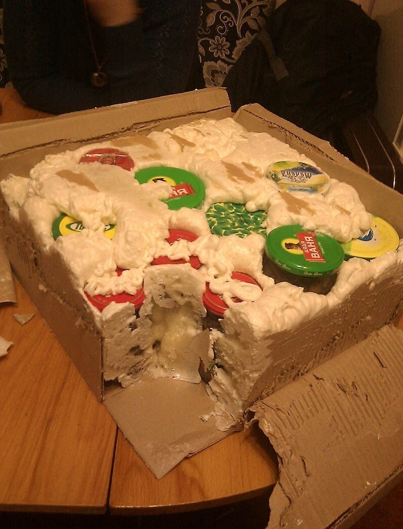 Отец решил привезти маринованные грибы. Чтобы не разбить банки, он залил их монтажной пеной