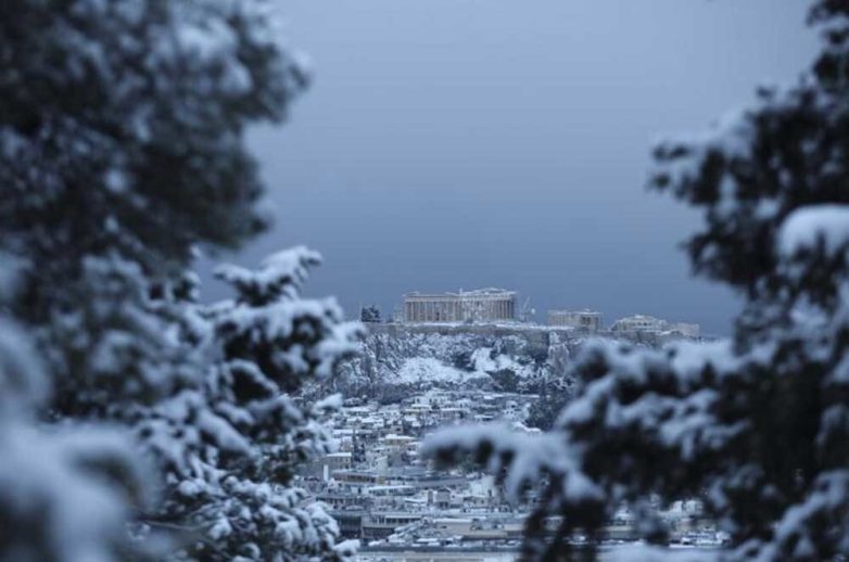 16. Редкий кадр — вид на заснеженный Афинский Акрополь