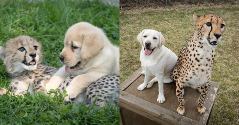 8. Для выращивания в зоопарке довольно нервных и пугливых детёнышей гепардов в качестве компаньона к ним подселяют щенков — представителей добродушных пород