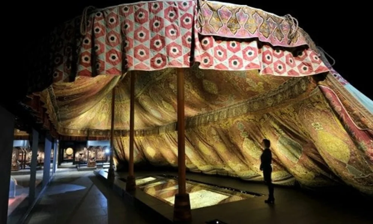 13. Шатёр XVII века, изготовленный из шёлка и позолоченной кожи, выставлен в Турецкой палате Дрезденского оружейного зала.