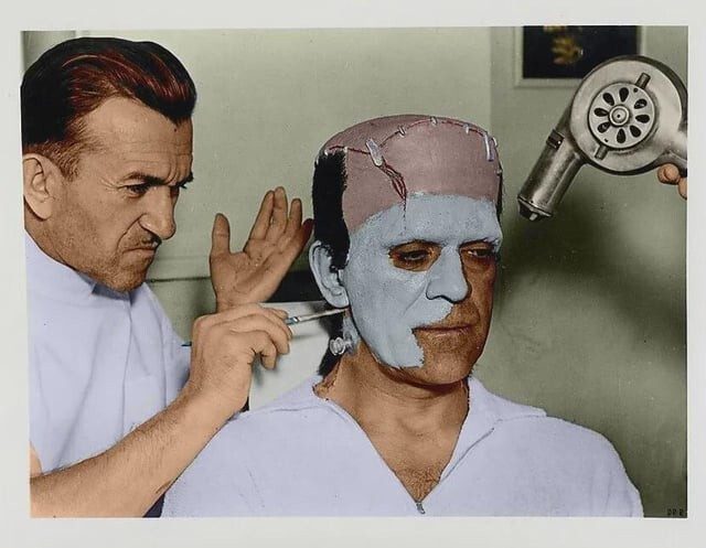 Легендарный гримёр Джек Пирс работает с Борисом Карлоффом над его гримом для экранизации «Франкенштейна» 1931 года