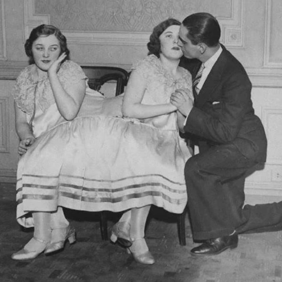 Маргарет целует в щёку жениха, а Мэри якобы смущённо посматривает на них со стороны. Калифорния, 1940-е годы
