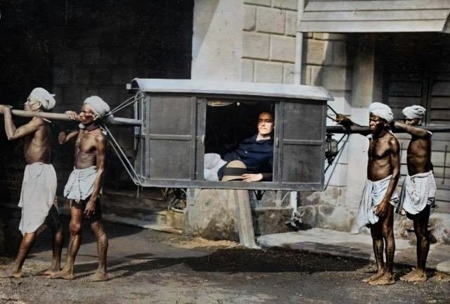 Четверо индийских носильщиков несут западного туриста в паланкине. Индия, 1922 год.