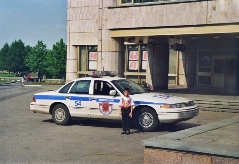 Фото на память. Парень возле Ford Crown Victoria московского ГАИ у кинотеатра «Волгоград», 1993 год.