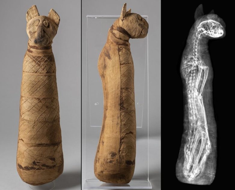 5. Мумифицированная кошка, завёрнутая в полотно. Справа рентгеновский снимок мумии. Египет, 400–200 гг. до н. э.