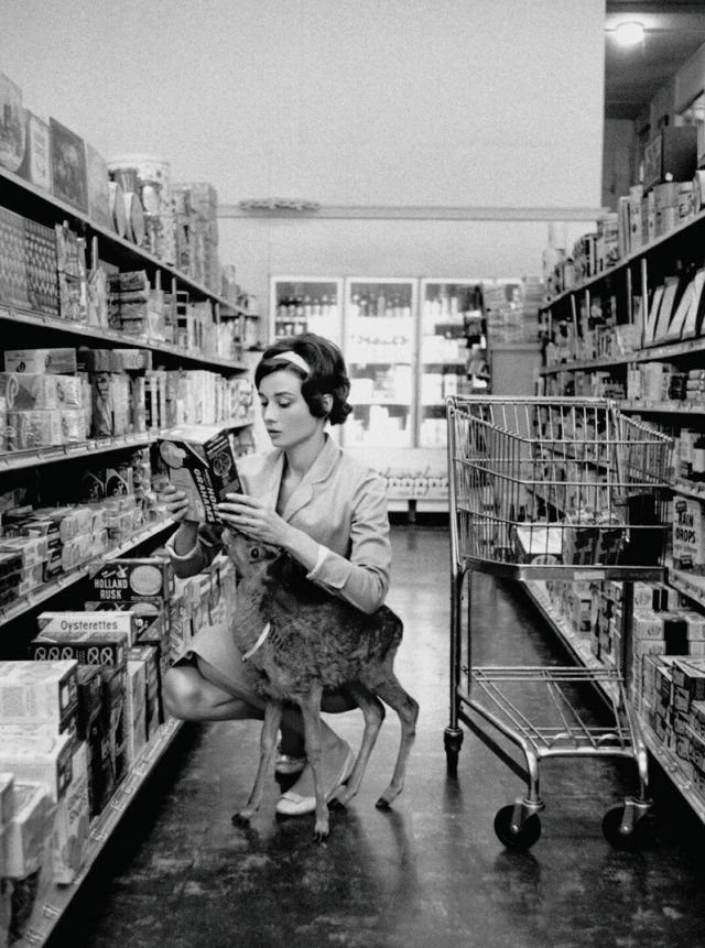 Одри Хэпберн в магазине Беверли Хиллз вместе со своим домашним оленем, 1956 год.