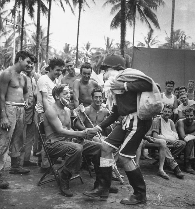 Санта-Клаус вручает подарки раненым американским солдатам на Гуадалканале в Рождество, 25 декабря 1943 года.