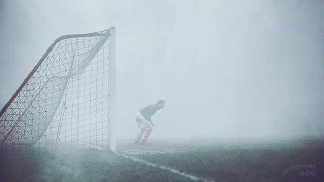 Вратарь Сэм Бартрам, оставшийся один на поле, который ещё не понял, что игра была прервана 15 минут назад из-за сильного тумана, 25 декабря 1937 года