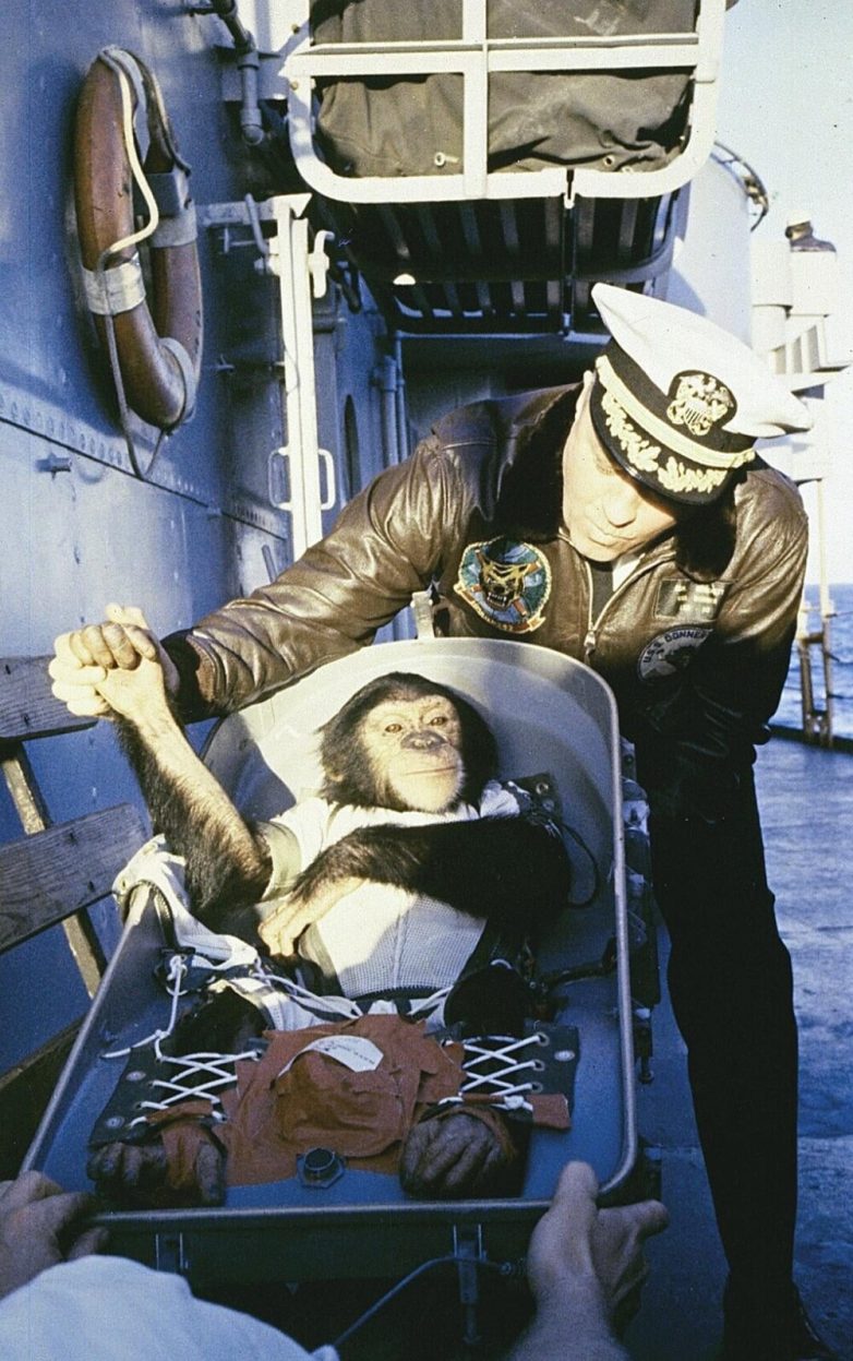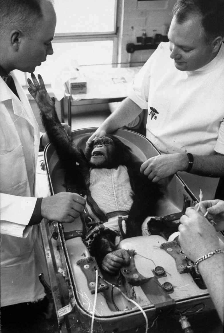 Шимпанзе Хэм, пристёгнутый ремнями для полёта в космос, 31 января (1961 г.)