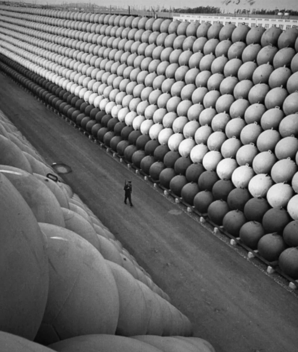 Охранник идёт по шоссе US Highway 101, где стоят высокие стопки полых железных поплавков, на которых во время последней войны были подвешены противолодочные сети для защиты портов США, 1953 год