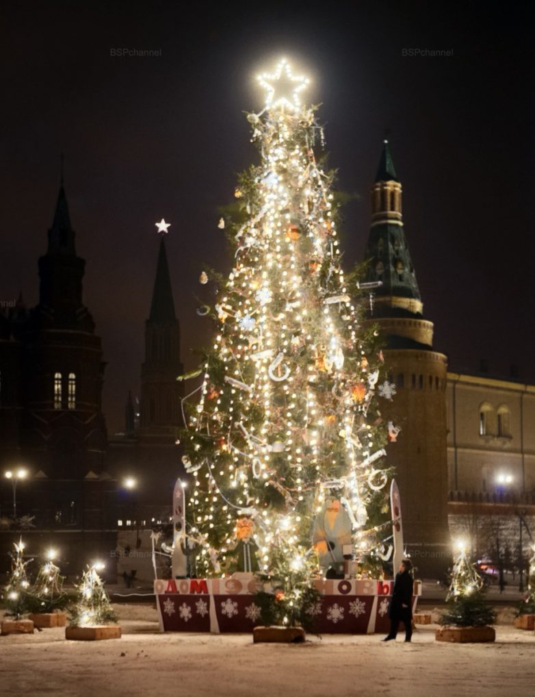 Новогодняя ёлка, украшенная иллюминацией. Москва, 1968 год.