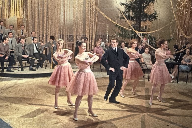 Певец Эдуард Хиль и танцевальная группа «Алые паруса» выступают на Центральном телевидении в «Голубом огоньке», 1970 год.