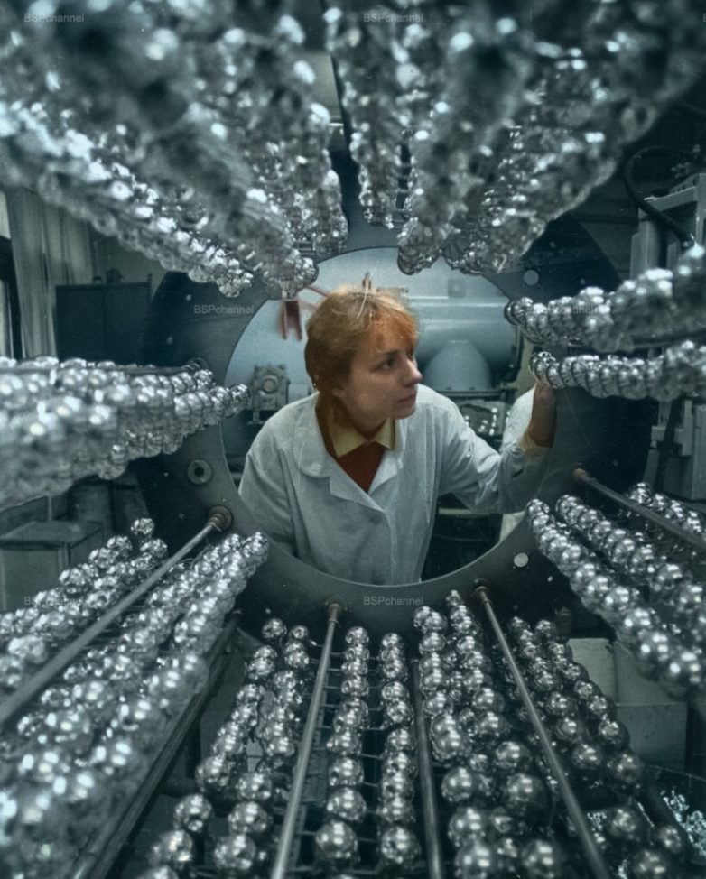Мастер фабрики «Ёлочные украшения» объединения «Игрушка» С.В. Гридюшко проверяет качество ёлочных игрушек после глазурования, 1986 год.