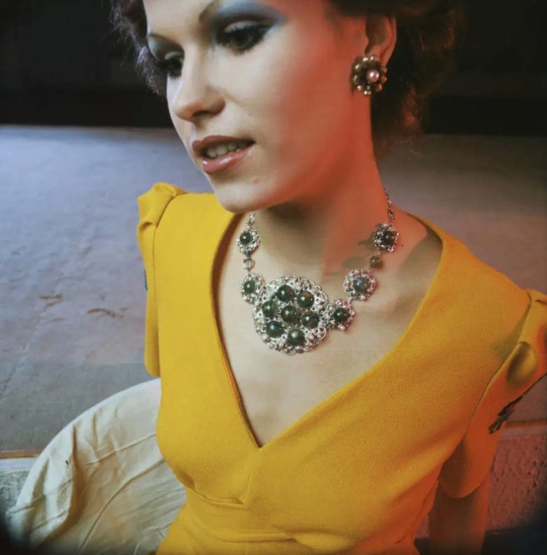 Ноябрь 1975 года. Москва. Модель в вечернем наряде демонстрирует серебряные украшения. Фото Виктора Великжанина.