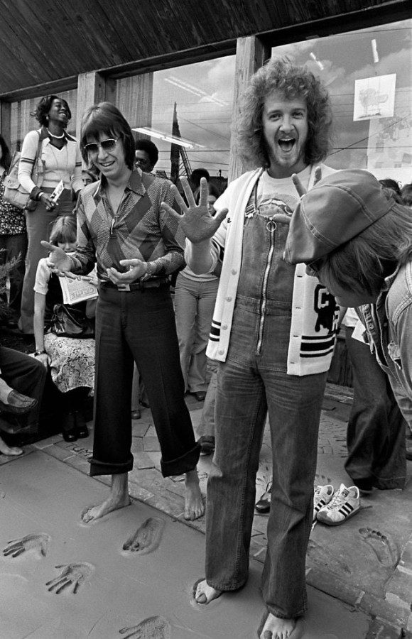 20 ноября 1975 года. Атланта, Джорджия. Уолтер Паразейдер и Ли Локнейн из группы Chicago оставляют отпечатки рук и ног на презентации в магазине Peaches Records. Фото Tom Hill.