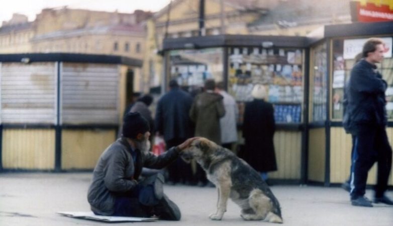 Бездомный со своей собакой на Сенной площади. Санкт-Петербург