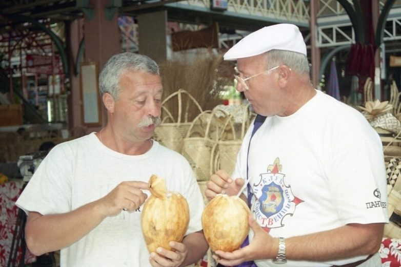 Телеведущий Леонид Якубович и ведущий телепрограммы «Клуб путешественников» Юрий Сенкевич на городском рынке в Папеэте (столице Французской Полинезии) обсуждают в кадре полезность сока кокоса для здоровья во время записи программы «Клуб путешественников», 15 апреля 1997 года.