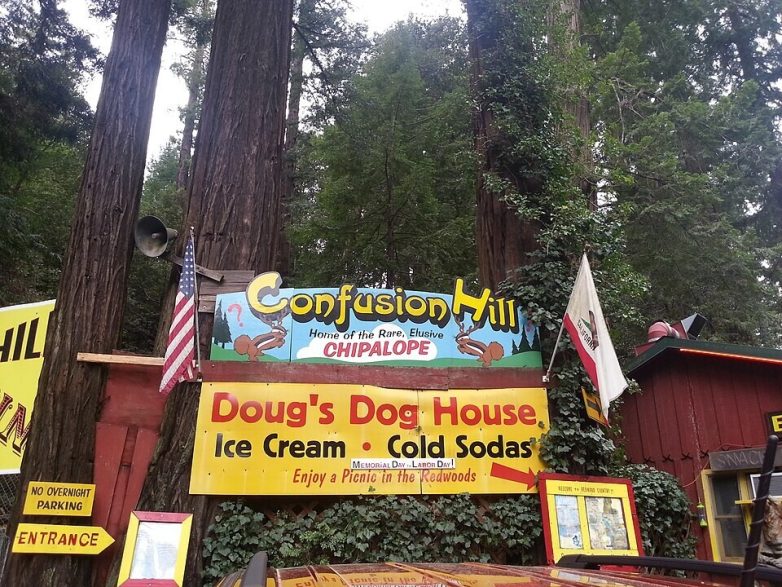 В калифорнийском городке Пирси находится аномальная зона «Холм заблуждения (путаницы)», построенная в 1949 году. Это искусственное сооружение, где гравитация будто бы перестаёт работать: вода течёт вверх, мяч катится на возвышение, а люди стоят под невозможным углом. Эффект создаётся благодаря хитроумным оптическим иллюзиям и наклону самого здания относительно горизонта. Место овеяно легендами о призраке инженера Дона Кэмпбелла, который, как говорят, после смерти продолжает шутить над посетителями.