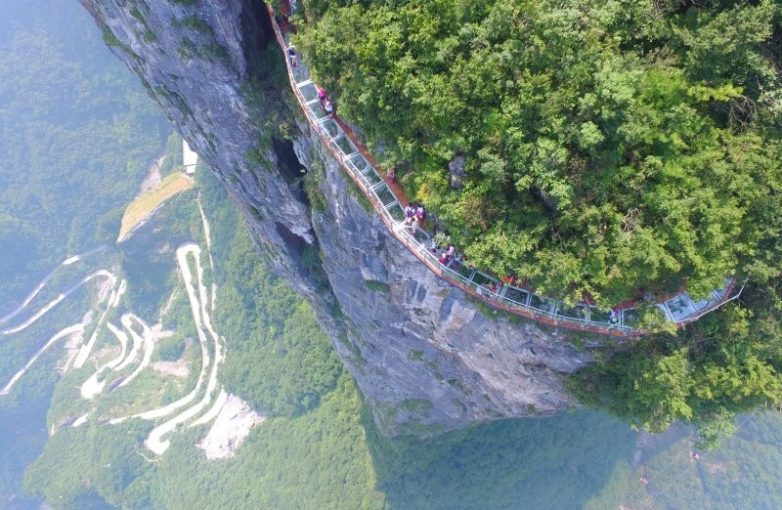 На высоте 1430 метров по отвесной скале горы Тяньмэнь («Врата небес») вьётся стеклянная тропа длиной 60 метров и шириной менее метра. Под ногами у смельчаков – лишь прозрачное стекло, а внизу – пропасть. Это одна из самых экстремальных смотровых площадок мира, требующая недюжинной смелости. Чтобы сохранить хрупкое покрытие, посетители надевают бахилы. Из-за опасности работы по обслуживанию и мытью стекла здесь являются одними из самых высокооплачиваемых и рискованных.