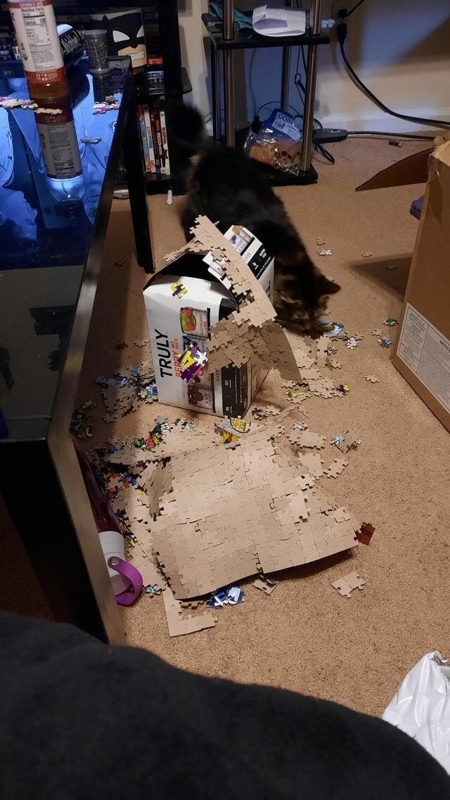Я заканчивала собирать свою картину из 1000 пазлов, как вдруг мой кот решил запрыгнуть на стол и повалить всё на пол
