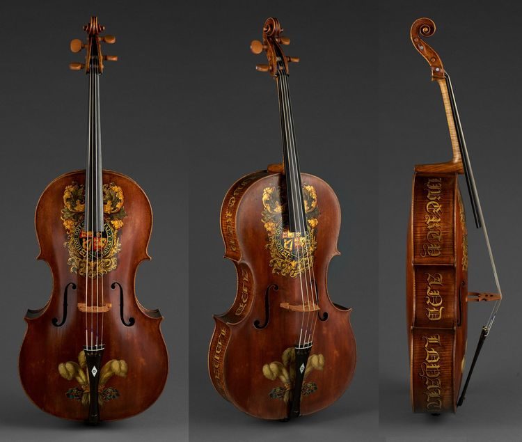 9. Виолончель «Королевский Георг», изготовленная для короля Георга IV, с надписями «Свобода и верность» по бокам. Изготовлена Уильямом Форстером. Великобритания, 1782 год