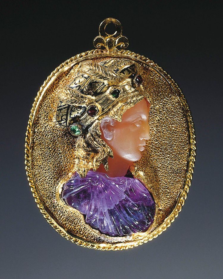 12. Французский кулон коммессо с женским бюстом, выполненный из золота, аметиста, сердолика, бирманского рубина, русского граната и колумбийского изумруда. Около 1550-1560 гг. н.э., в настоящее время является частью Королевской коллекции