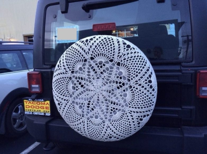 Бабушка хотела связать что-то масштабное. Зато теперь запасное колесо имеет ручной чехол