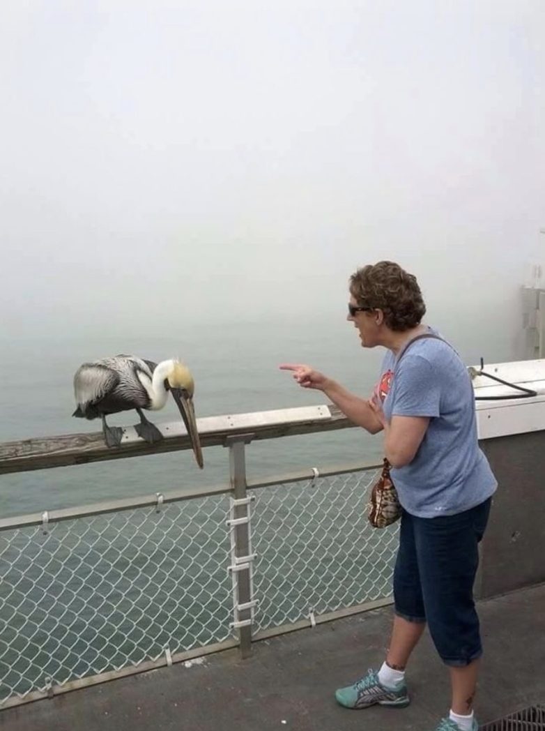 Бабушка отчитывает пеликана за то, что он по своей невнимательности врезался в нее